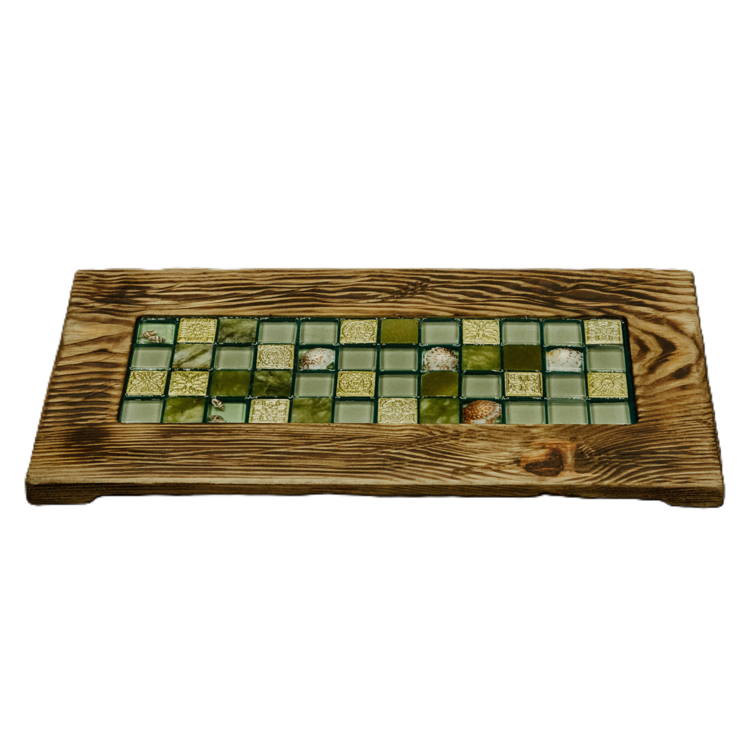 Deska do serwowania z mozaiką 3D ze szkła i naturalnych elementów w odcieniach zieleni. Postarzane drewno sosnowe, spokojny, naturalny klimat inspirowany morzem i naturą. Ręczna robota, każda deska jest inna.
