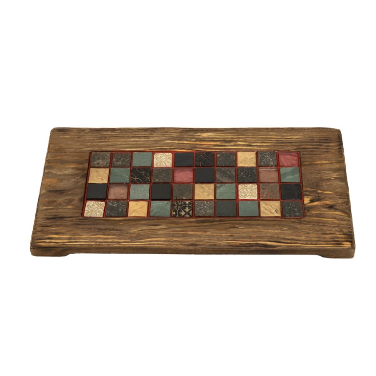 W środku masz pole złożone z małych kwadratów tworzących trójwymiarową mozaikę – kamień w odcieniach czerni, grafitu, butelkowej zieleni, beżu, z dodatkiem złotych detali. Całość osadzona jest w postarzanej desce z litej sosny, która wygląda, jakby miała już swoją historię.