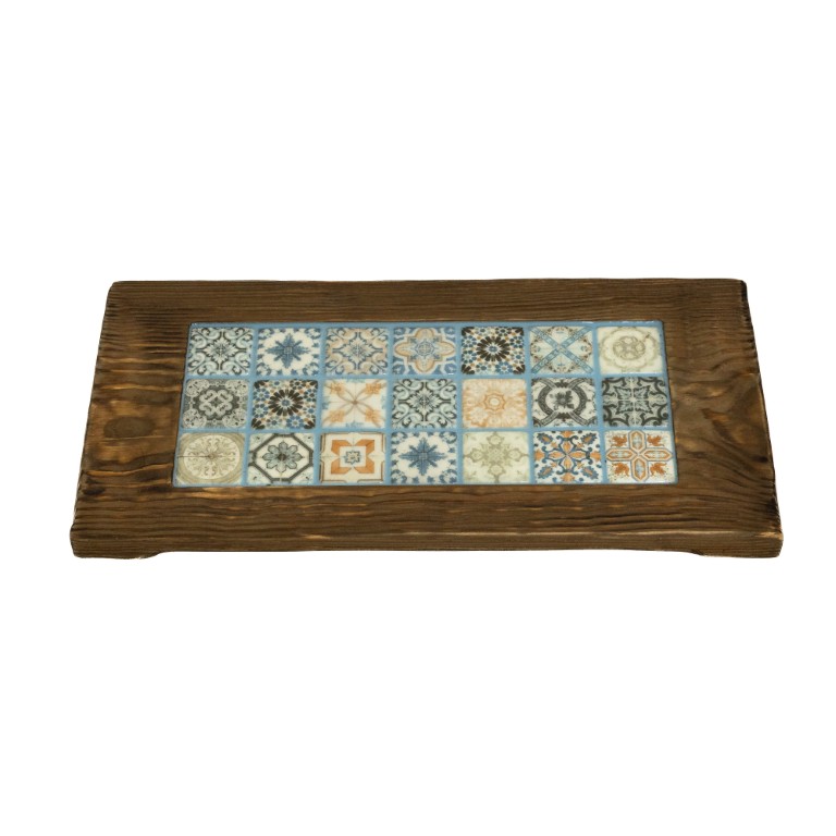 Wypełnieniem wewnątrz deski sosnowej jest mozaika w stylu azulejos, przeważający kolor błękitny i niebieski z dodatkami innych kolorów. Fugowanie żywicą epoksydową w kolorze niebieskim . Deska wsparta jest na 3 kaboszonach, dwa ozdobne oraz jeden z logo firmy. Całość pokryta została olejem , który zabezpiecza drewno przed wilgocią i może mieć kontakt z żywnością. Wymiary 20×40 cm Zdjęcia przedstawiają przykładową deskę, kupowana może się różnić układem wzorów na mozaice, usłojeniem drewna i jego kolorem