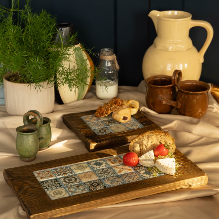 Nasza deska do serwowania to podróż w czasie i przestrzeni. Inspirowana tradycyjnymi portugalskimi azulejos, przeniesie Cię do słonecznych, nadmorskich miasteczek. Połączenie ciepłego drewna i chłodnej niebieskiej ceramiki tworzy harmonijną kompozycję, która przyciąga wzrok i uspokaja zmysły. Nierówna powierzchnia i głębokie bruzdy dodają desce charakteru i sprawiają, że każda chwila spędzona przy niej jest wyjątkowa.