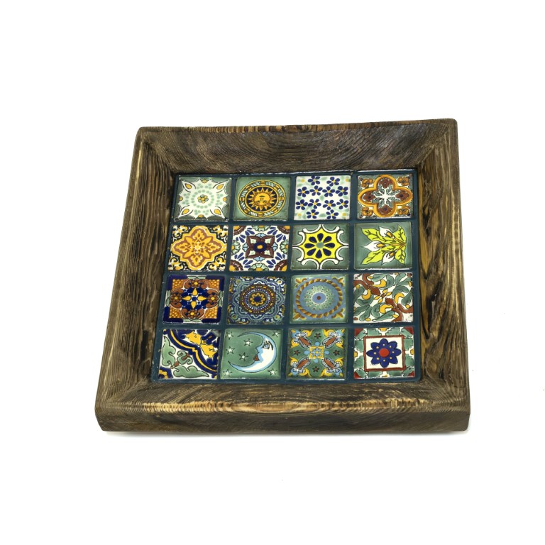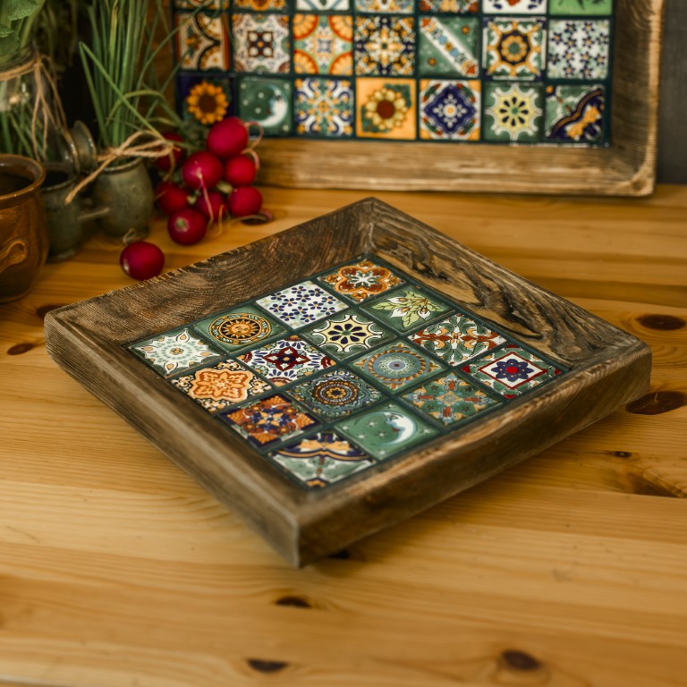 Większa miska z 16 płytek Talavera Verde – harmonia zieleni i naturalnego drewna.