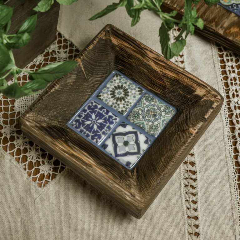 • Połączenie natury i sztuki: Ciepłe, naturalne drewno spotyka się z  kafelkami w stylu azulejos, tworząc harmonijną całość. Każda miseczka jest unikalna, dzięki czemu zyskujesz niepowtarzalny element dekoracyjny.