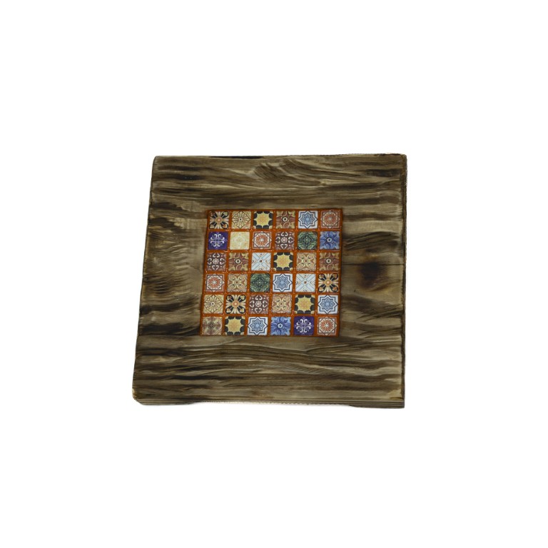 Specyfikacja: • Wymiary: 20×20 cm • Drewno: sosna, olej naturalny • Kolor: niebiesko-granatowy • Mozaika: 36 elementów ceramicznych