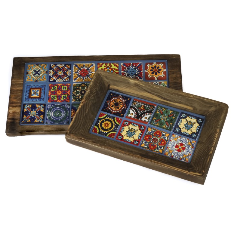 Zimowa kolekcja inspirowana błękitem i bielą – połączenie klasycznej mozaiki Talavera z naturalnym drewnem. Duża deska z 18 płytek i miska z 8 płytek tworzą harmonijny duet, który przyciąga wzrok i dodaje wnętrzu klasy.